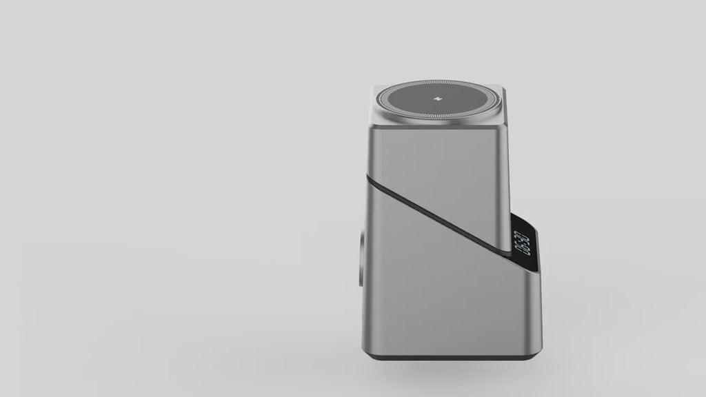 With built-in MagSafe-compatible charging, digital clock display, and a clean geometric build, it powers your iPhone, AirPods, and Apple Watch simultaneously — while keeping your setup sleek and organized.